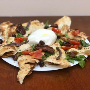 Delicioso plato con 300 g de burrata fresca adornada con tomates cherry frescos, tomates secos, aceitunas, anchoas y rúcula. Acompañados de una sabrosa y crujiente explanada de pizza horneada en el momento.